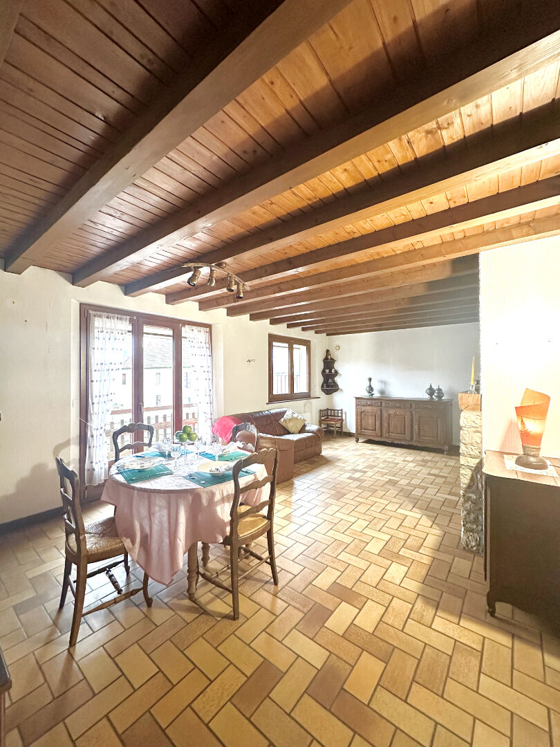 Cette maison, issue d’une ancienne ferme rénovée en 1985, se développe sur trois niveaux et offre de beaux volumes ainsi qu’un fort potentiel d’évolution. Les poutres en bois apparentes apportent un charme à l’ensemble.
